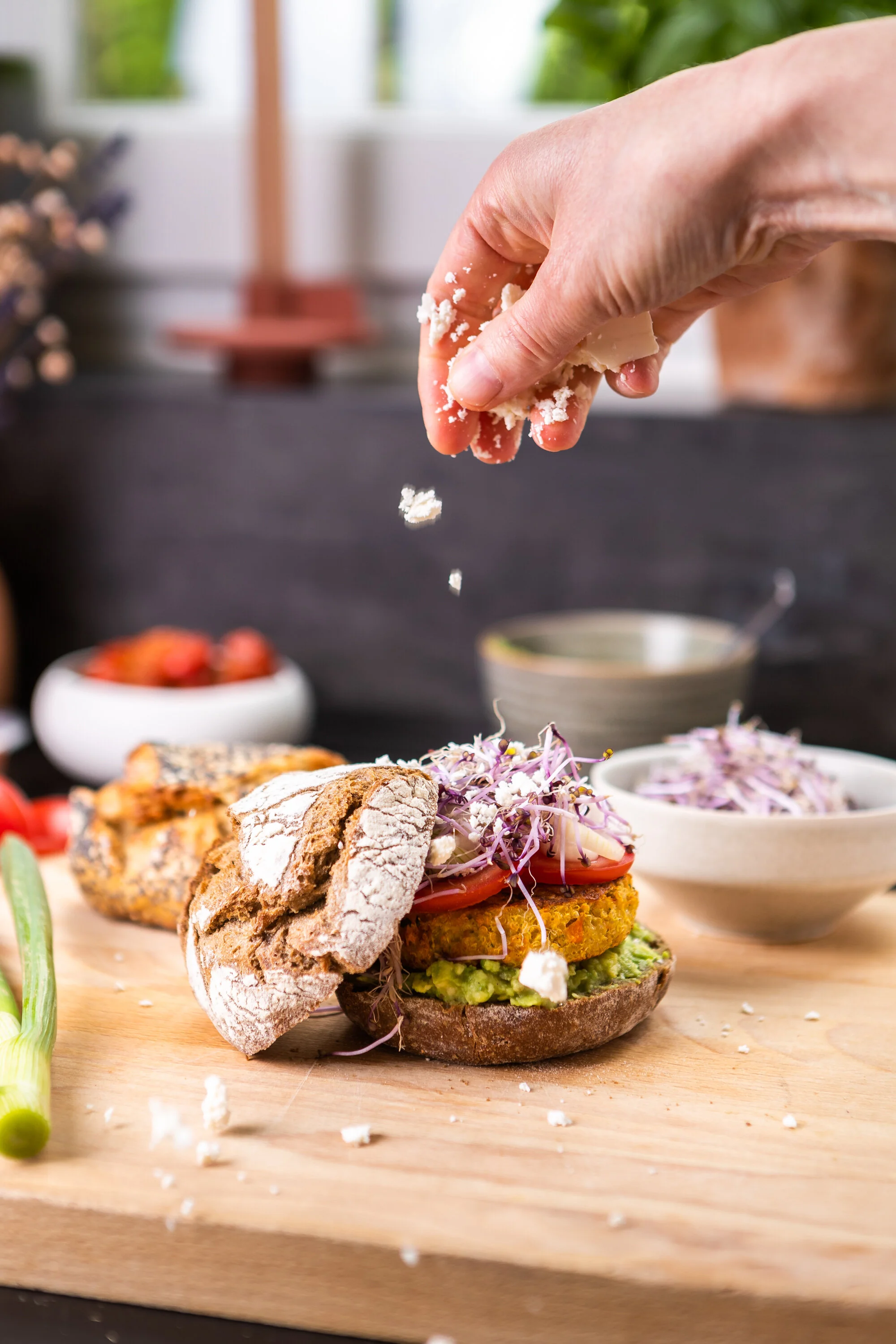 5 — Vervolledig vervolgens met dunne schijfjes tomaat, bietenkiemen, de uitjes en een flinke portie feta.